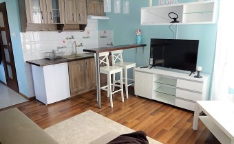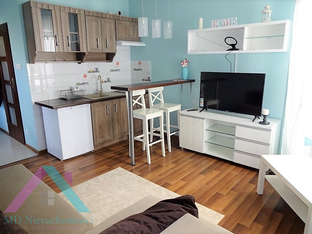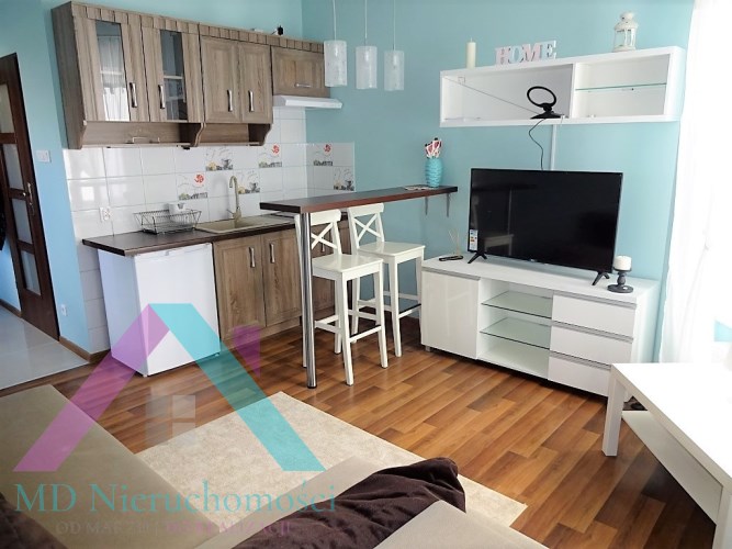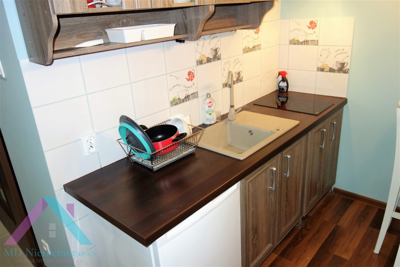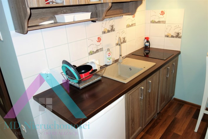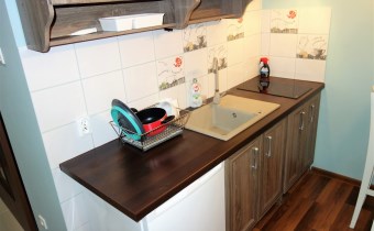 - WNĘKA KUCHENNA: szafki kuchenne, zlewozmywak, płyta kuchenna 2 palniki, lodówka, bufet z 2 stołkami barowymi