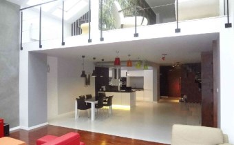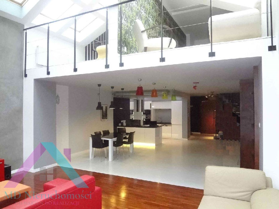 olbrzymi salon, który w najwyższym punkcie ma 6m wysokości, duże okna typu witryna bardzo dobrze doświetlające całą powierzchnię (dodatkowo okna dachowe), na podłodze parkiet, w salonie skórzany komplet wypoczynkowy (narożnik + ława skórzana), szezląg, szafka pod telewizory, telewizor 42", zestaw kina domowego,