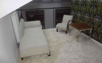 na podłodze wykładzina, szafa typu Komandor z drzwiami przesuwnymi, okna dachowe od strony wschodniej (zainstalowane rolety przeciwsłoneczne), łóżko podwójne z 2 toaletkami, szezląg, 2 fotele, ława,
