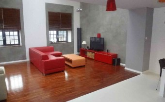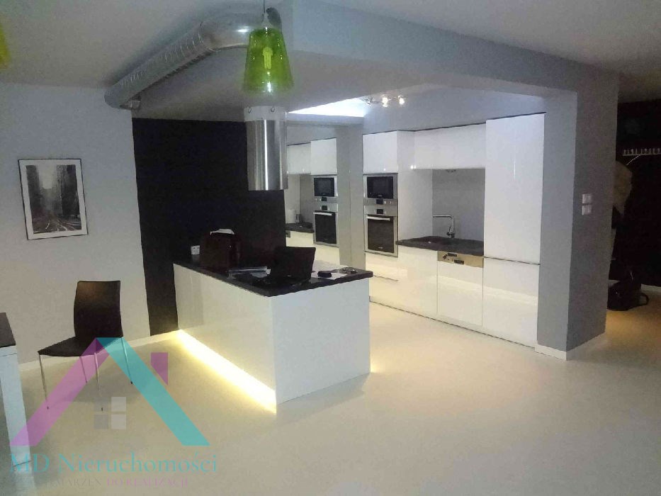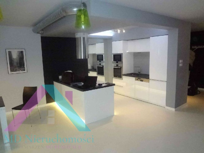 - SALON Z ANEKSEM KUCHENNYM: olbrzymi salon, który w najwyższym punkcie ma 6m wysokości, duże okna typu witryna bardzo dobrze doświetlające całą powierzchnię (dodatkowo okna dachowe), na podłodze parkiet, w salonie skórzany komplet wypoczynkowy (narożnik + ława skórzana), szezląg, szafka pod telewizory, telewizor 42", zestaw kina domowego,