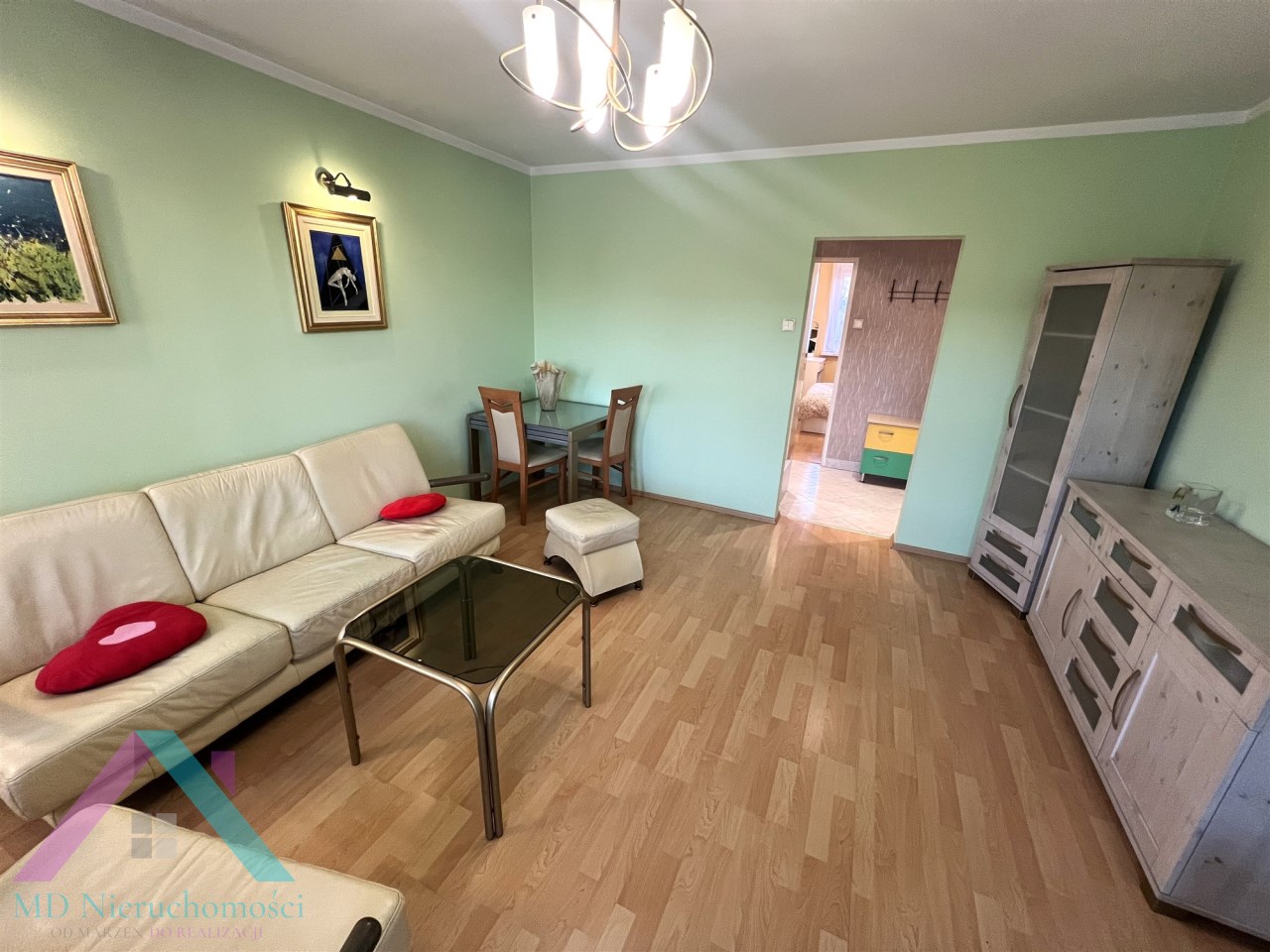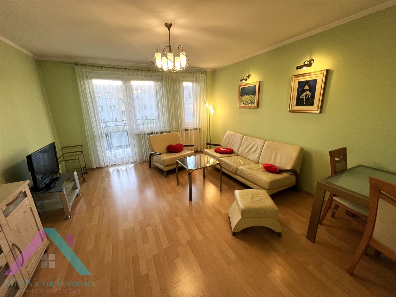 - SALON: witryna, komoda, kanapa (nierozkładana), fotel, pufa - skóra , telewizor i stolik pod telewizor, ława szklana, stół + 2 krzesła, dywan, lampa stojąca, lampa górna wisząca,