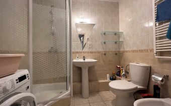 - ŁAZIENKA Z WC: glazura, terakota, kabina prysznicowa, nowa pralka, sedes, bidet, umywalka z nogą, półki szklane,